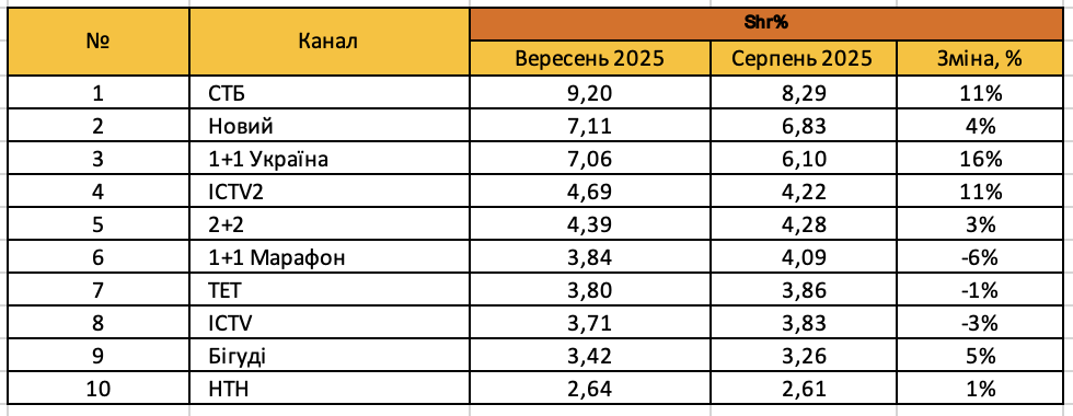 В ТОП 10 каналів за часткою перегляду в вересні на першому місці лишається СТБ, друге за Новим каналом. Третє і четверте місця займають канали 1+1 Україна та ICTV2 відповідно.