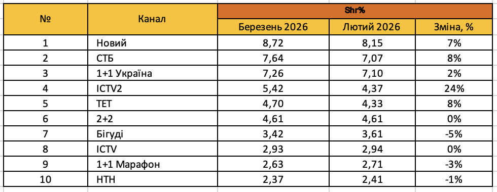 В ТОП 10 каналів за часткою перегляду в березні на першому місці лишається Новий канал, на другому - СТБ. Третє і четверте місця займають канали 1+1 Україна і 2+2 відповідно.