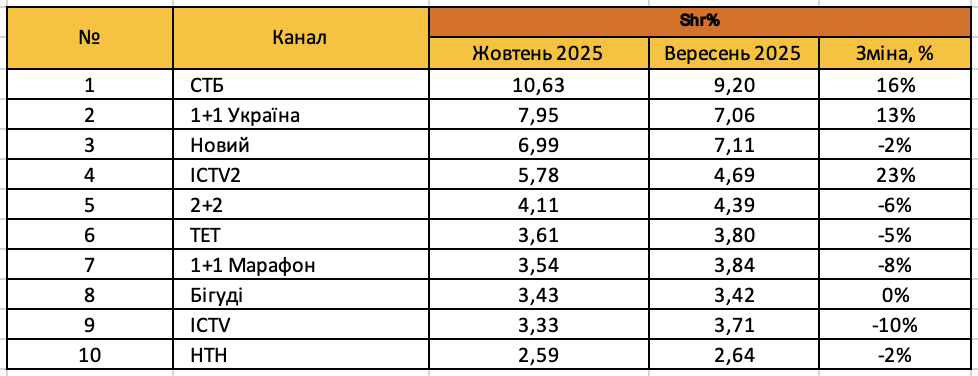 В ТОП 10 каналів за часткою перегляду в жовтні на першому місці лишається СТБ, друге за каналом 1+1 Україна. Третє і четверте місця займають канали Новий та ICTV2 відповідно.