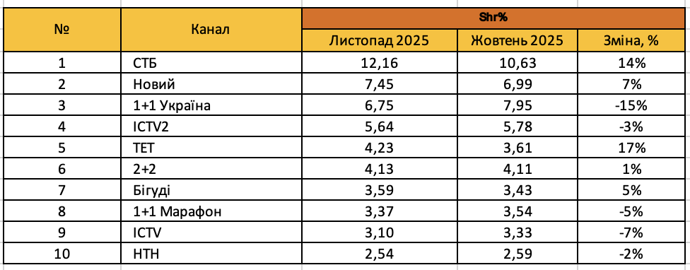В ТОП 10 каналів за часткою перегляду в листопаді на першому місці лишається СТБ, друге за Новим каналом. Третє і четверте місця займають канали 1+1 Україна та ICTV2 відповідно