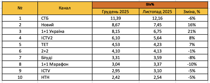 В ТОП 10 каналів за часткою перегляду в грудні перше місце продовжує утримувати канал СТБ, друге так само займає Новий канал. Третє і четверте місця займають канали 1+1 Україна та ICTV 2 відповідно.