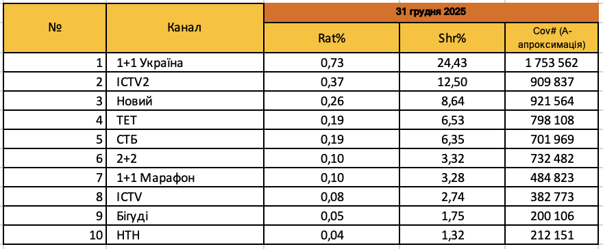 Традиційно в грудні ми визначаємо десятку каналів, які глядачі обрали в останній день року. Цього року лідером новорічного дня традиційно став канал 1+1 Україна, а загалом Топ 10 каналів 31 грудня зібрали 70,1% частки перегляду