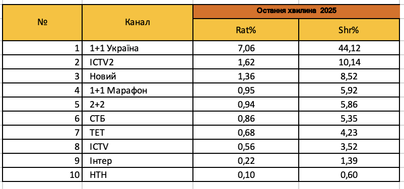 Також канал 1+1 Україна отримав найвищу частку в останню хвилину 2025 року – майже половина глядацької уваги (44,1%), в той же час як його прямий конкурент канал ICTV 2 зібрав менше (частка перегляду 10,1%). В цілому, в останню хвилину 2024 року Топ 10 каналів акумулювали 89,7% глядацької уваги